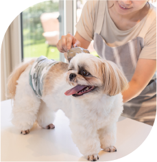 おうちの愛犬と一緒にトリミングを学ぶコースです。プロのようにはうまくできないけどトリミング出す前に気になる箇所をトリミングしたり、また老犬でトリミングに連れていけないわんちゃんをお手入れできるコースです。